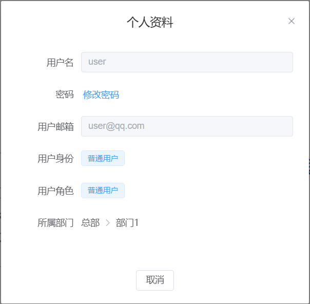 可以查看所属部门等信息,以及修改当前用户的密码。